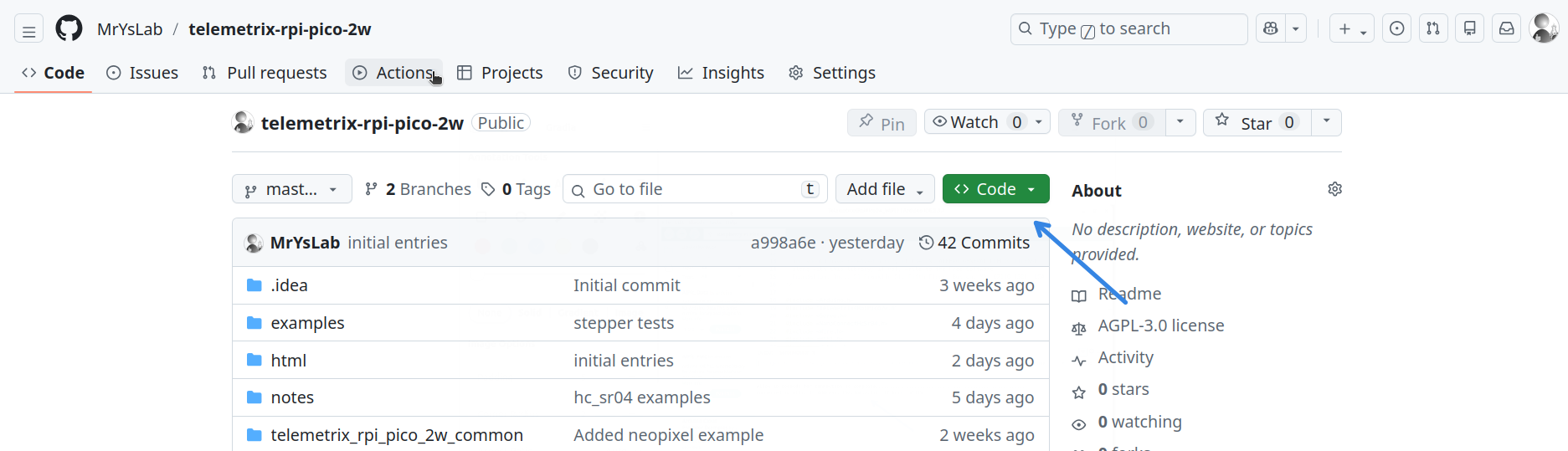 Go to the telemetrix-rpi-pico-2w GitHub repository. Click the green button in the upper-right corner and download the ZIP file.