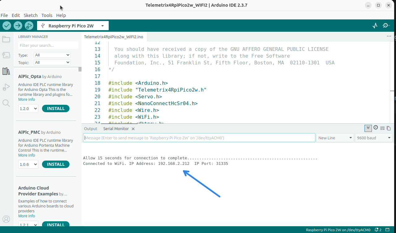 Repower the Pico, and the router's assigned IP address will appear in the Arduino IDE's serial monitor window.